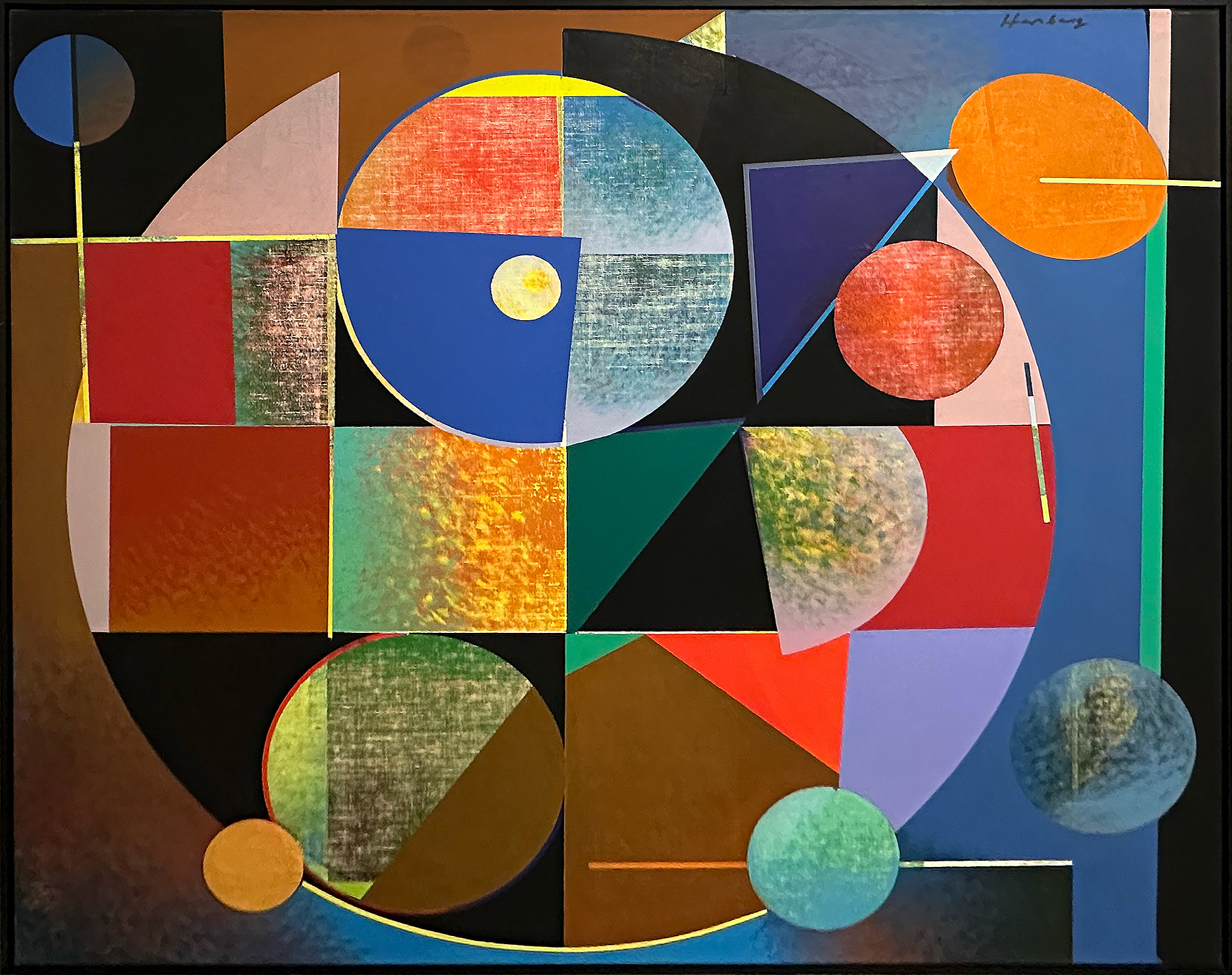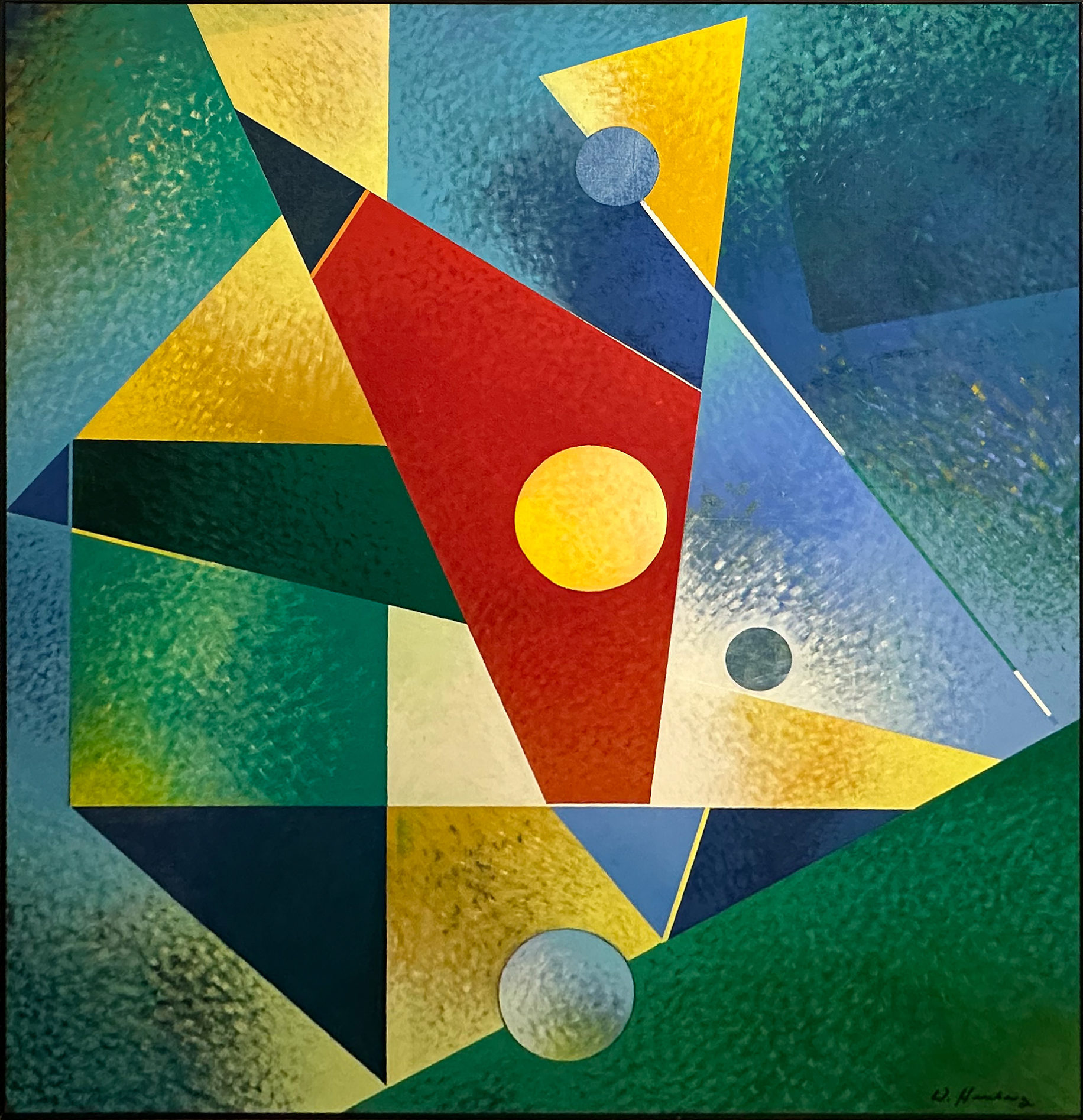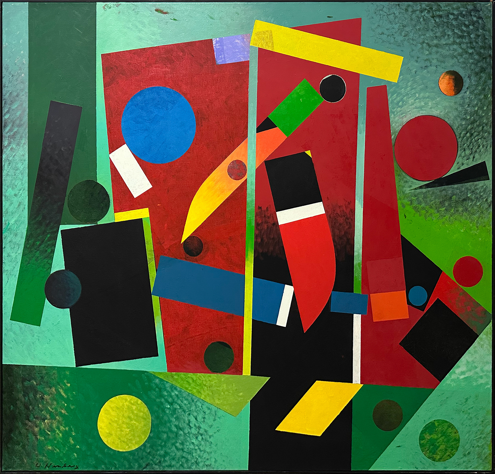Sa peinture s’organise alors autour de cercles, carrés, rectangles, arcs de cercle et signes, qui structurent la surface. Herzberg explique que cette attirance pour la géométrie vient « par curiosité », mais aussi de sa formation de graphiste et d’artisan d’art. Il se décrit volontiers comme un « Méditerranéen de Silésie », formule qui résume son goût pour les couleurs vives autant que sa nature disciplinée.