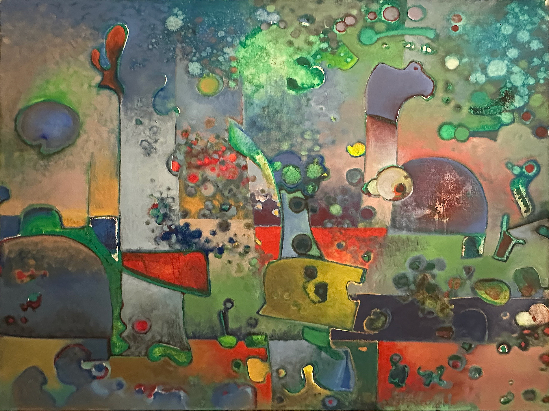Techniquement, il ne travaille qu’à l’huile, ce qui lui permet de reprendre les surfaces sans limite : « Je commence à travailler quand je n’ai pas d’idées », explique-t-il ; c’est en peignant que les formes et les couleurs s’imposent. Il n’accumule pas les empâtements : plutôt que de superposer les couches, il gratte, efface, rectifie. « Je ne jette rien », dit-il encore, préférant transformer une toile insatisfaisante plutôt que la détruire. Pendant un temps, il explore les collages – découpant et recollant des fragments de ses propres peintures – avant de revenir à une surface plus unifiée.